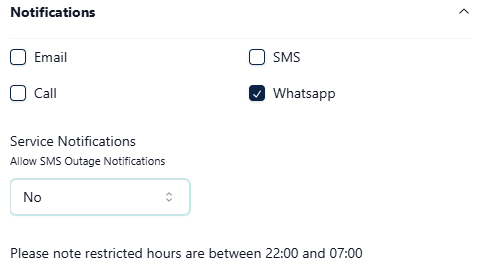 You can also choose whether to allow SMS outage notifications, including restricted hours.